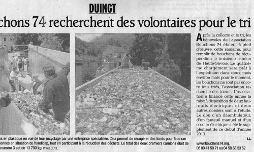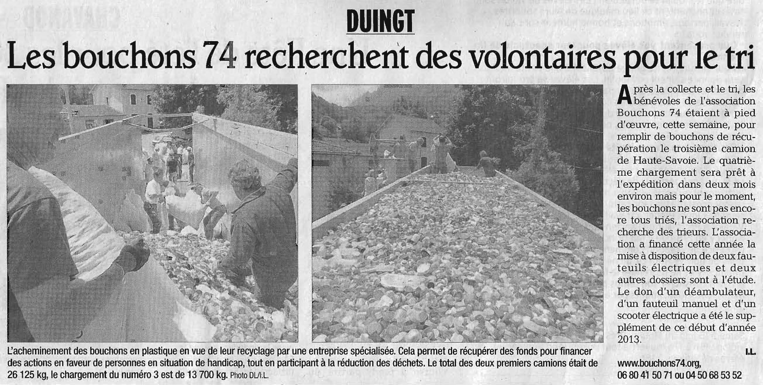Article du Dauphiné Libéré en date du : 14 juin 2013 ; Les Bouchons 74 recherchent des volontaires pour le tri