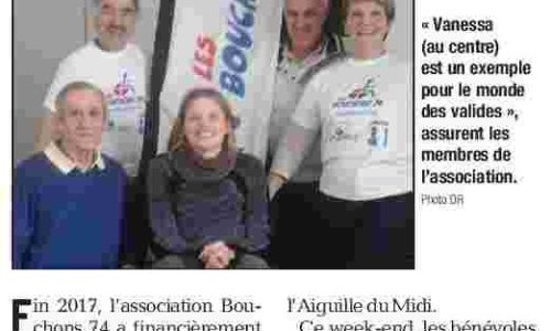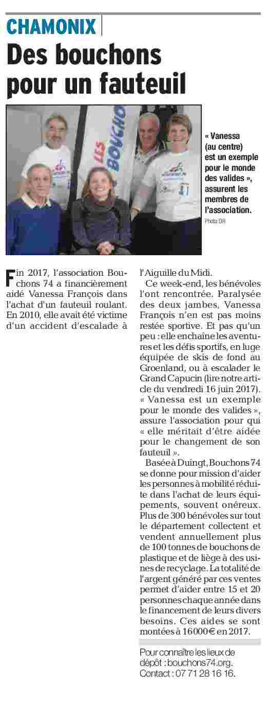 Article du Dauphiné Libéré en date du : 21/03/2018 ; CHAMONIX, des bouchons pour un fauteuil