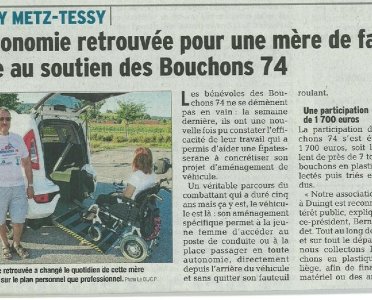Article du Dauphiné Libéré en date du : 29/08/2016 ; ÉPAGNY METZ-TESSY : L’autonomie retrouvée pour une mère de famille grâce au soutien des Bouchons 74