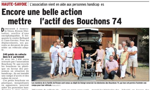 Article du Dauphiné Libéré en date du : 18/07/2018 ; une belle action des Bouchons 74