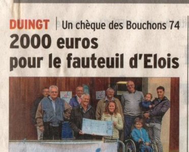 Article du Dauphiné Libéré en date du : 03/04/2017 : DUINGT ; Un chèque des Bouchons 74 de 2 000 euros pour le fauteuil d’Elois