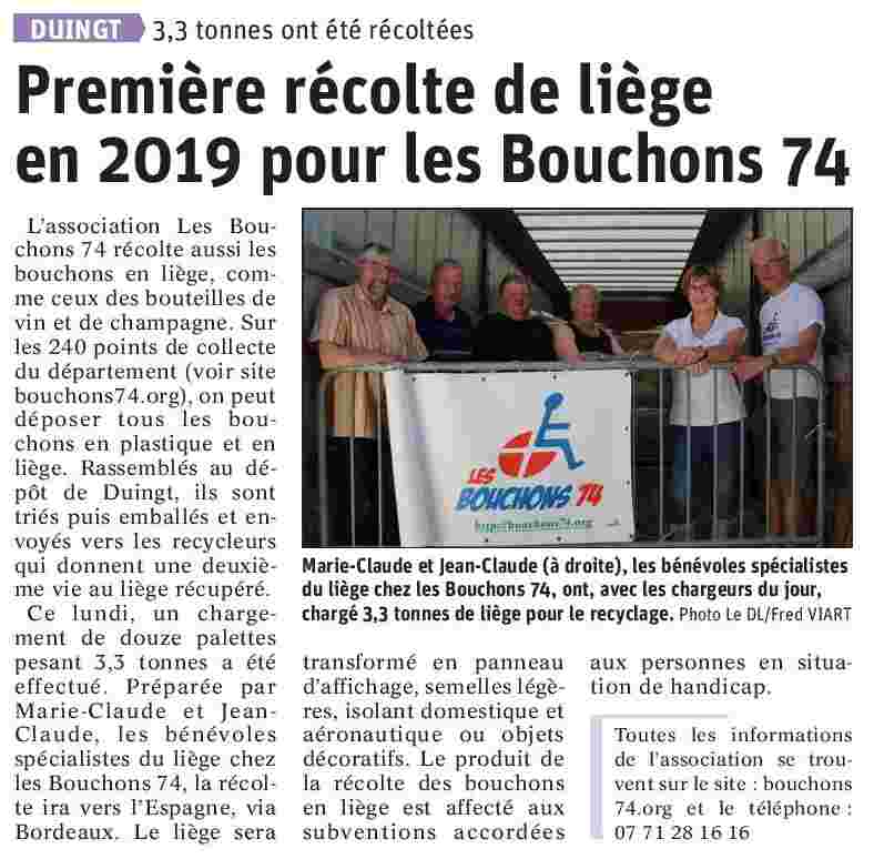 Article du Dauphiné Libéré en date du : 21/06/2019 ; chargement du 1er camion de bouchons liège 2019