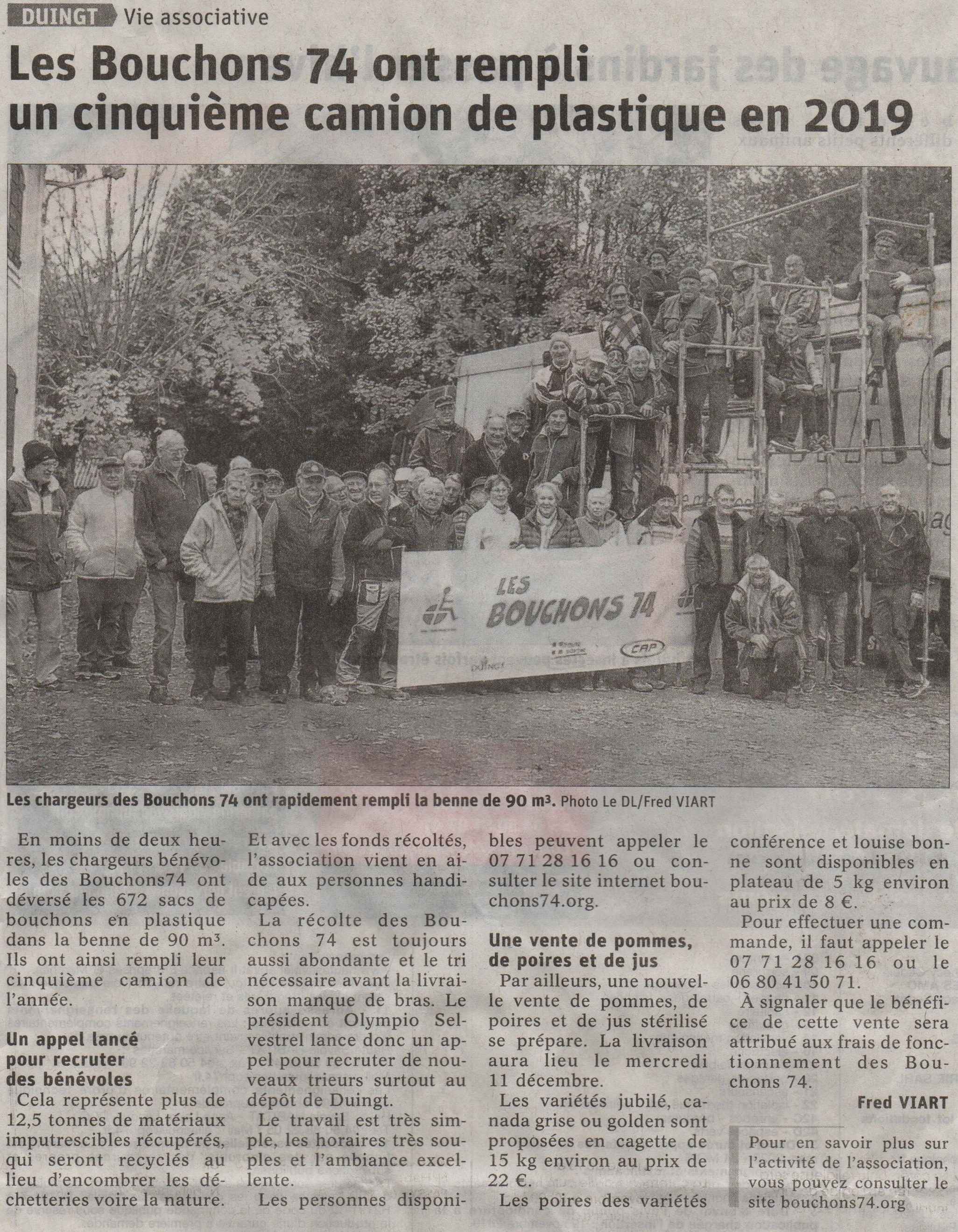 Article du Dauphiné Libéré en date du : 25/11/2019 ; DUINGT, Les Bouchons 74 ont rempli un cinquième camion de plastique en 2019