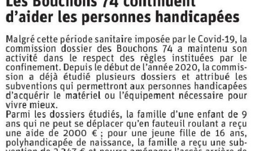 Article du Dauphiné Libéré en date du : 08/04/2020 ; DUINGT, Les Bouchons 74 continuent d’aider les personnes handicapées