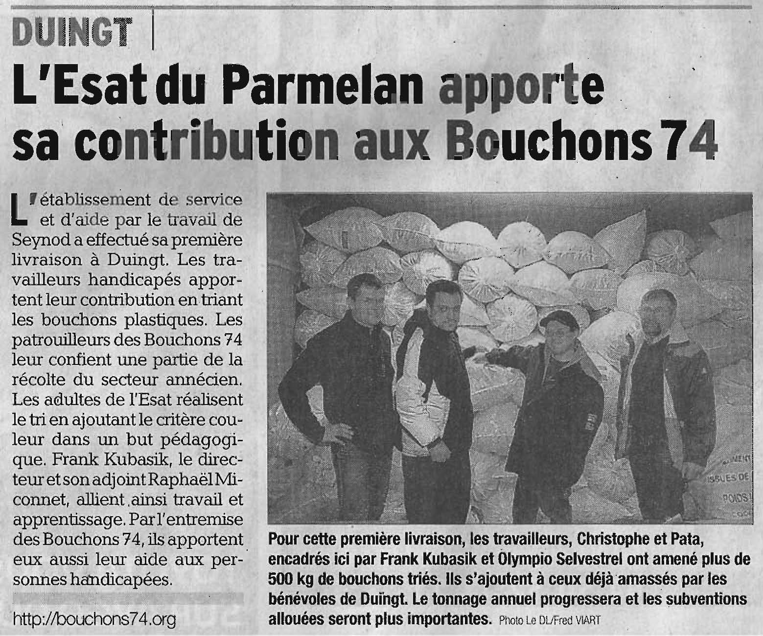 Article du Dauphiné Libéré en date du : 01 décembre 2013 ; L’ESAT du Parmelan apporte sa contribution aux Bouchons 74