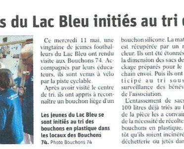 Article du Dauphiné Libéré en date du : 14/05/2022 ; DUINGT : Les jeunes joueurs du Lac Bleu initiés au tri des bouchons
