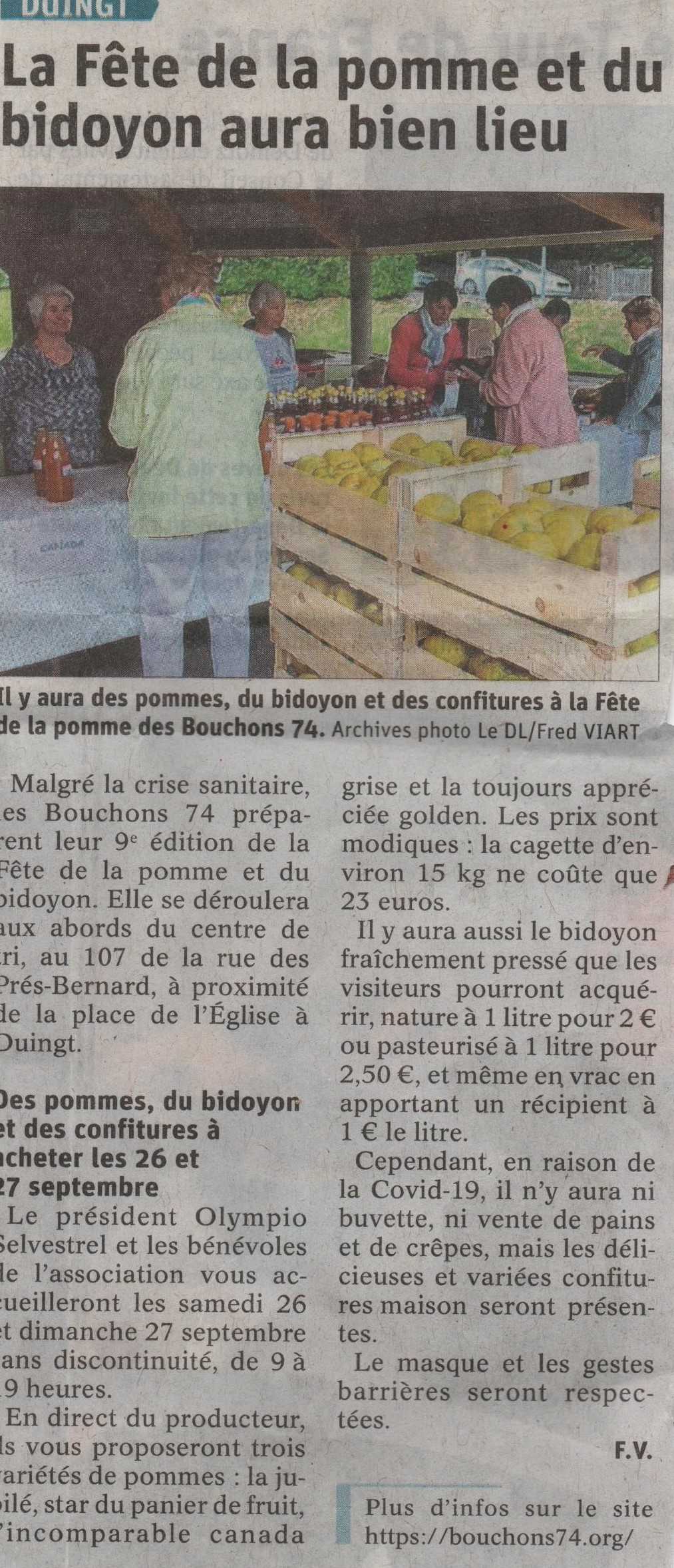 Article du Dauphiné Libéré en date du : 20/09/2020 ; Saint-JORIOZ ; La Fête de la pomme et du bidoton aura bien lieu