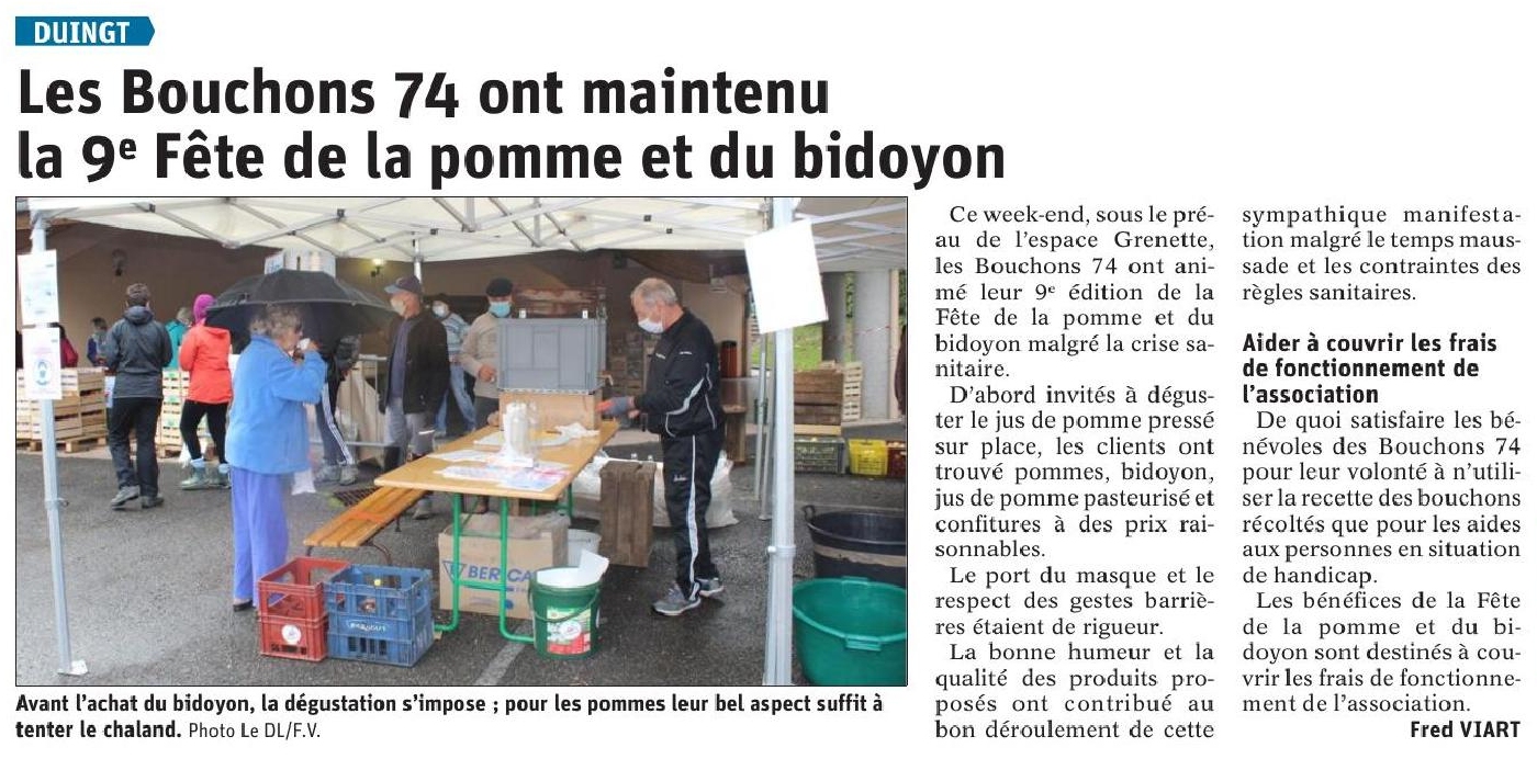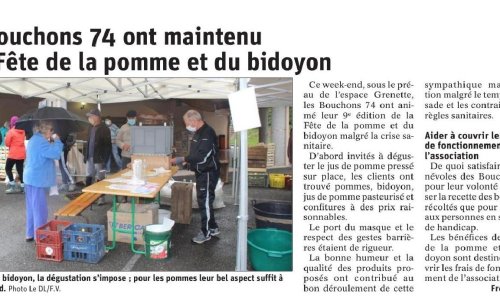 Article du Dauphiné Libéré en date du : 29/09/2020 ; DUINGT : Les Bouchons 74 ont maintenu la 9ème Fête de la pomme et du bidoyon