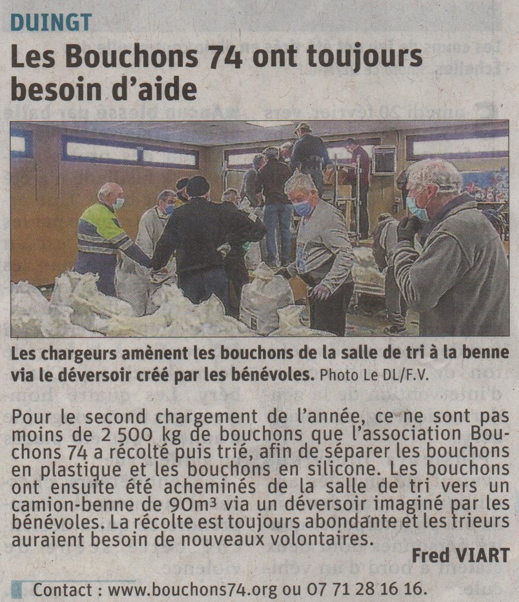 Article du Dauphiné Libéré en date du : 18/02/2021 ; DUINGT : Les Bouchons 74 ont toujours besoin d’aide
