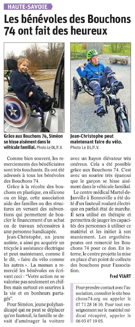 Article du Dauphiné Libéré en date du : 02/03/2021 ; Haute-Savoie : Les bénévoles des Bouchons 74 ont fait des heureux.