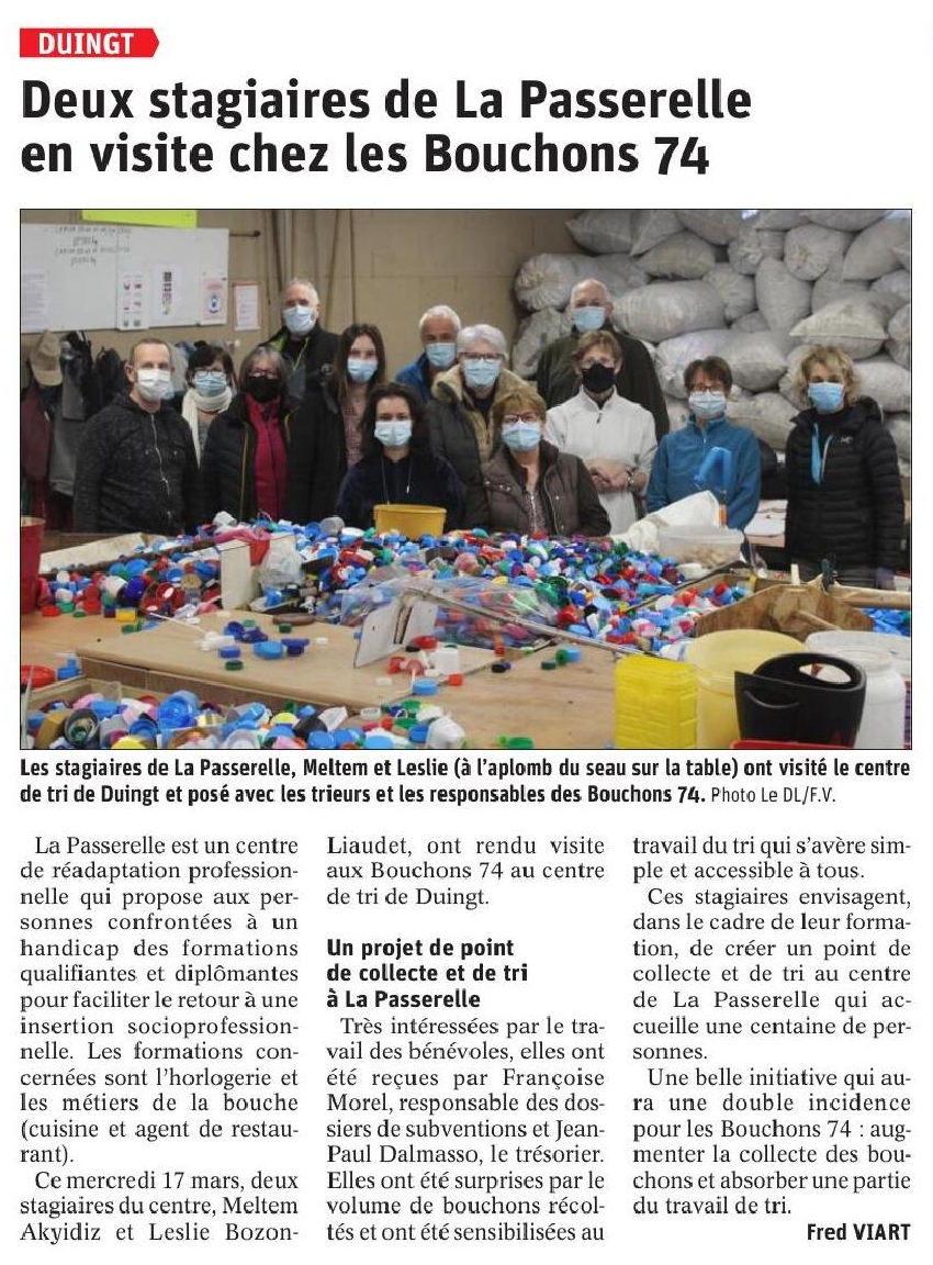 Article du Dauphiné Libéré en date du : 19/03/2021 ; DUINGT : Deux stagiaires de la Passerelle en visite chez les Bouchons 74