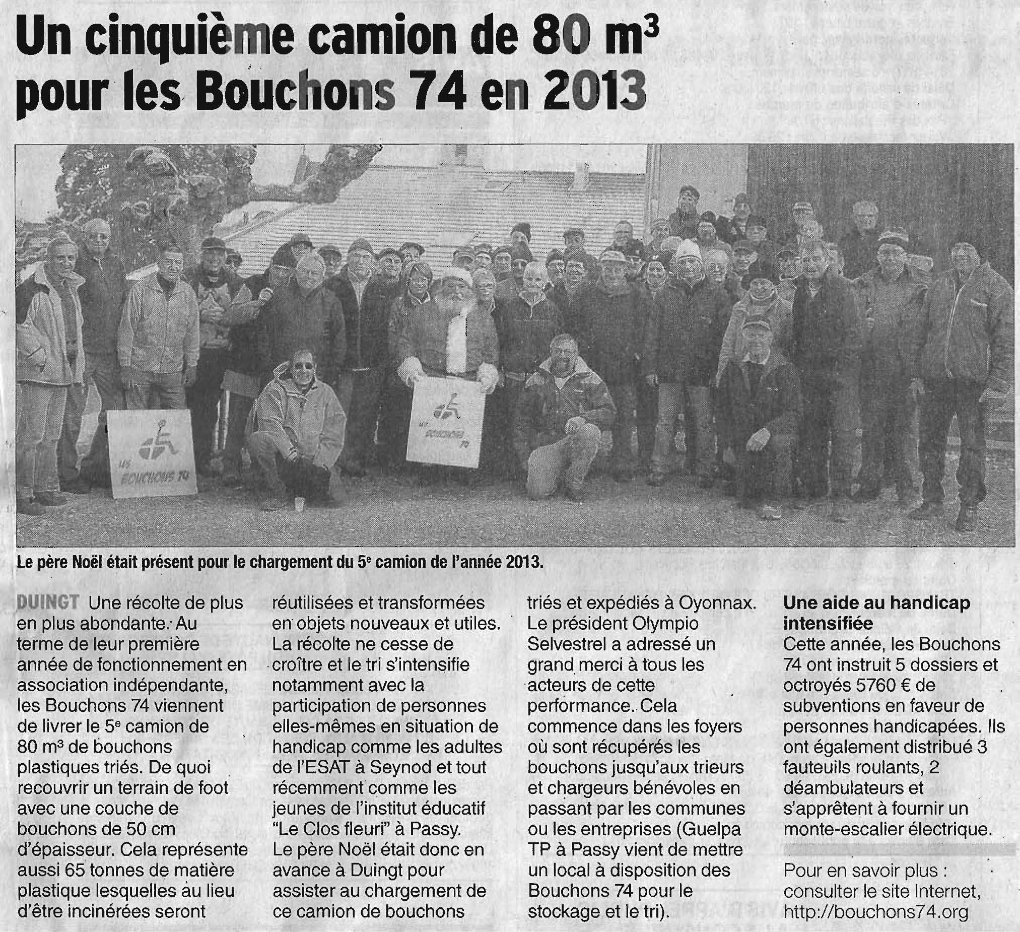 Article du Dauphiné Libéré en date du : 16 décembre 2013 ; Un 5ème camion de 80 m3 pour les Bouchons 74 en 2013