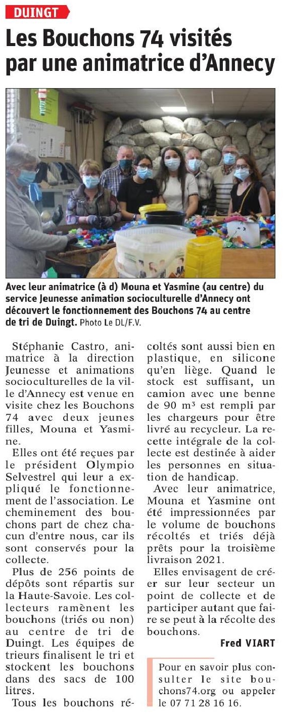 Article du Dauphiné Libéré en date du : 04/04/2021 ; DUINGT : Les Bouchons 74 visités par une animatrice d’ANNECY