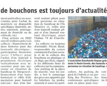 Article du Dauphiné Libéré en date du : 17/03/2022 ; LES GETS : La collecte de bouchons est toujours d’actualité