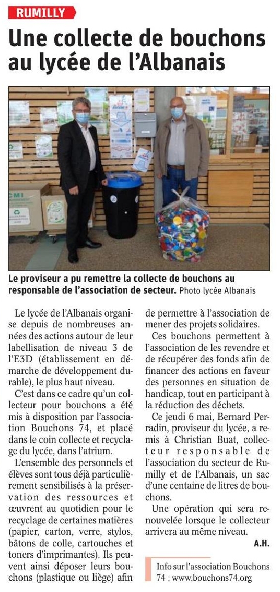 Article du Dauphiné Libéré en date du : 10/05/2021 ; RUMILLY : Une collecte de bouchons au lycée de l’Albanais