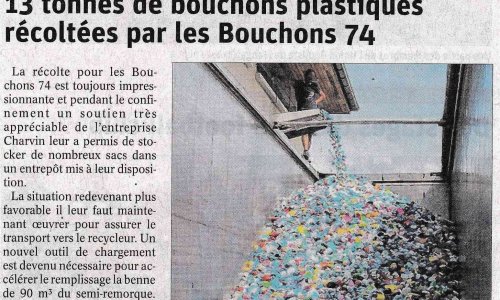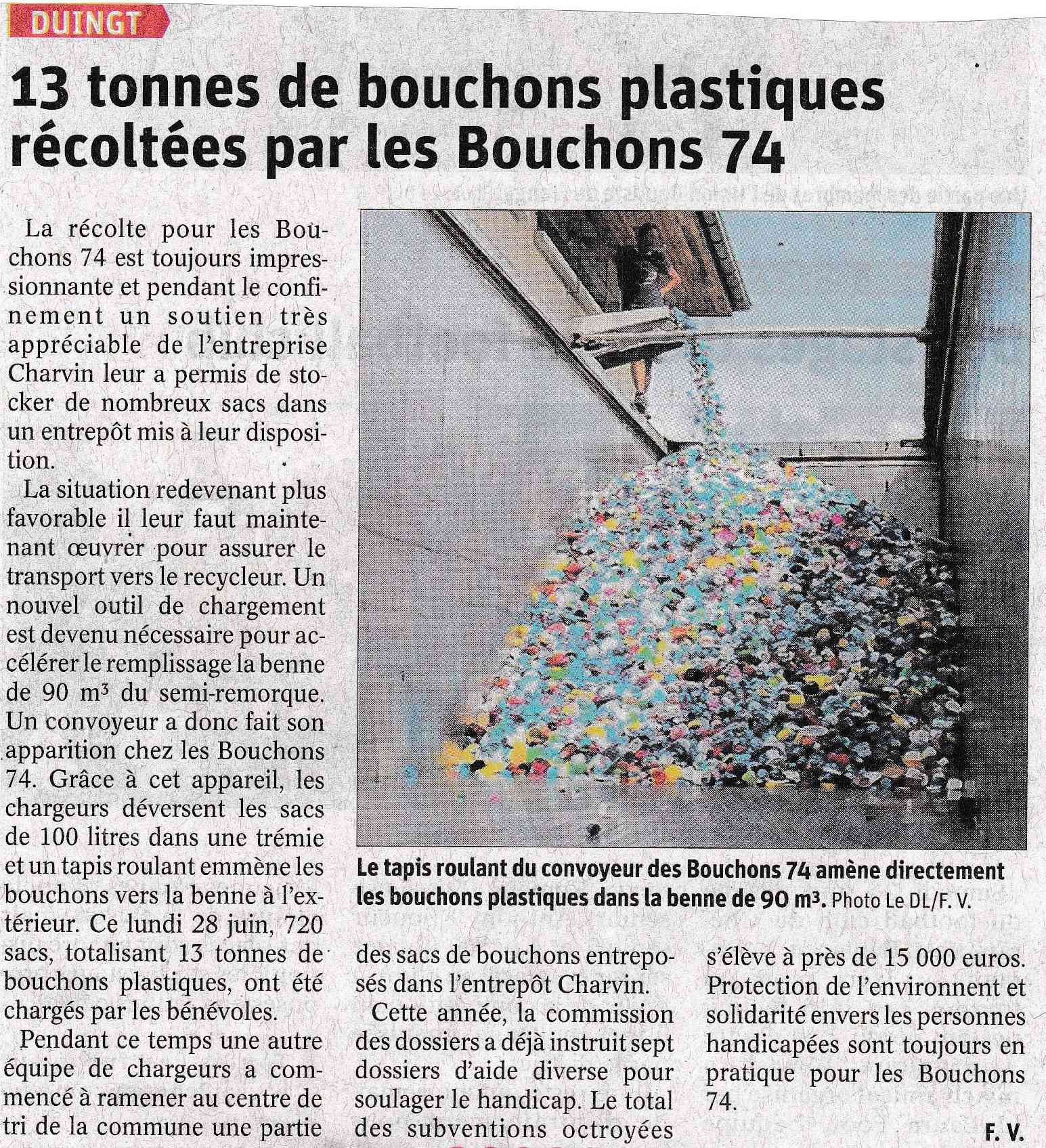 Article du Dauphiné Libéré en date du : 28/06/2021 ; DUINGT : 13 tonnes de bouchons plastiques récoltés par les Bouchons 74