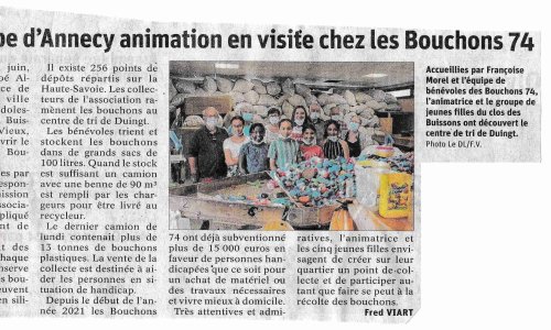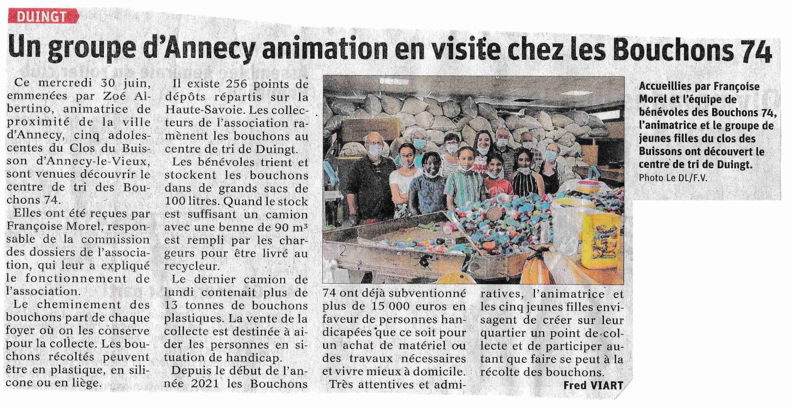 Article du Dauphiné Libéré en date du : 03/07/2021 ; DUINGT : Un groupe d’Annecy animation en visite chez les Bouchons 74