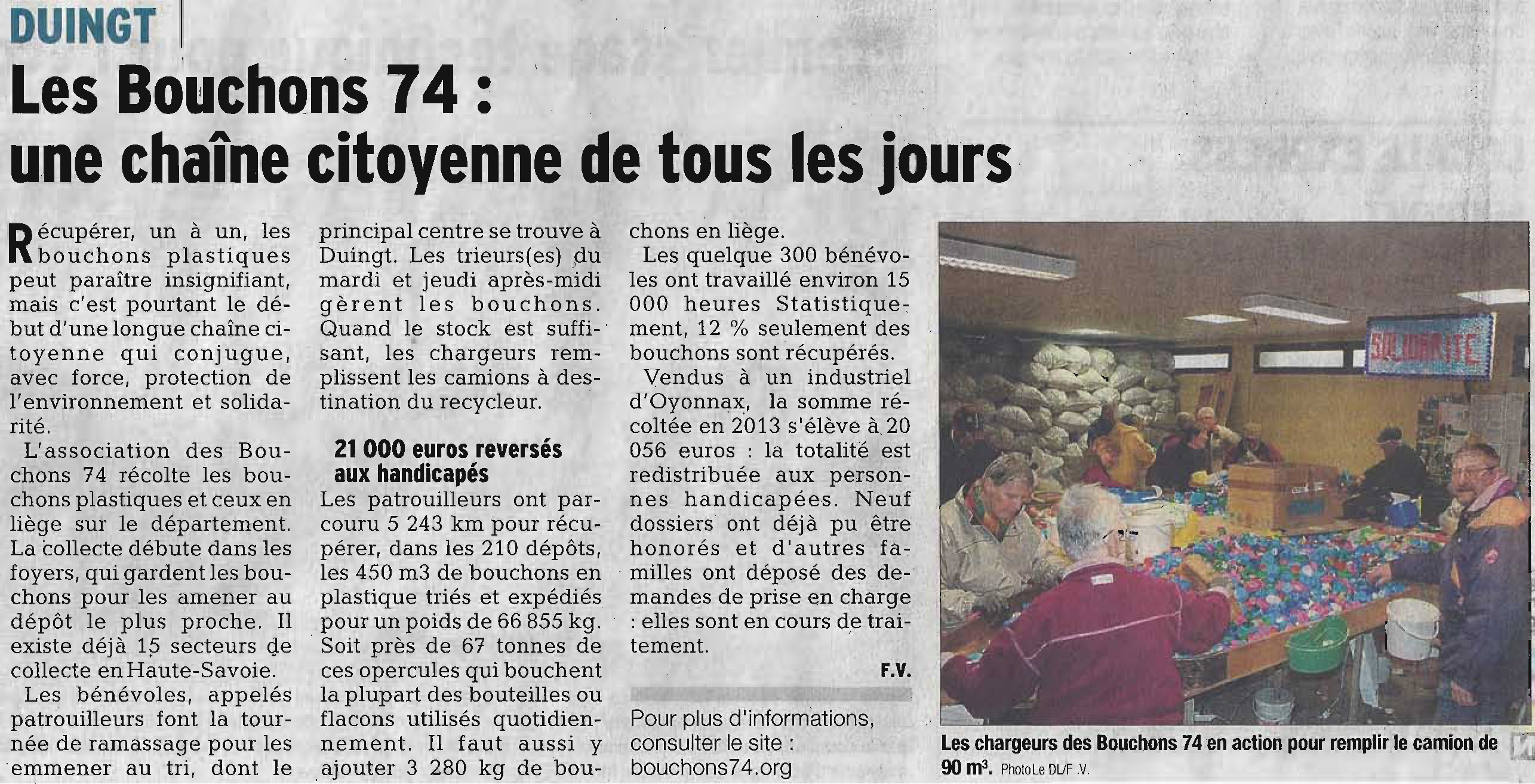 Article du Dauphiné Libéré en date du : 26/02/2014 ; Les Bouchons 74 , une chaîne citoyenne de tous les jours