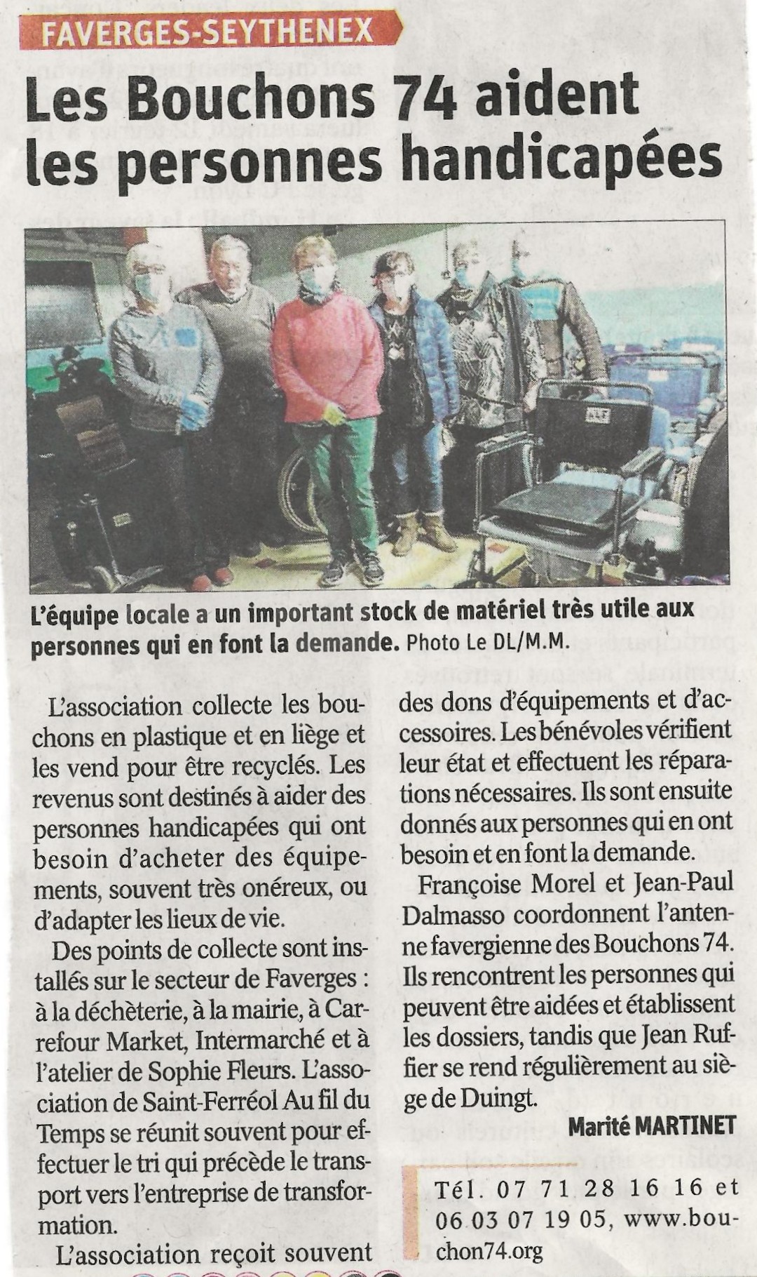 Article du Dauphiné Libéré en date du : 11/02/2022 ; FAVERGES-SEYTHENEX : Les Bouchons 74 aident les personnes handicapées