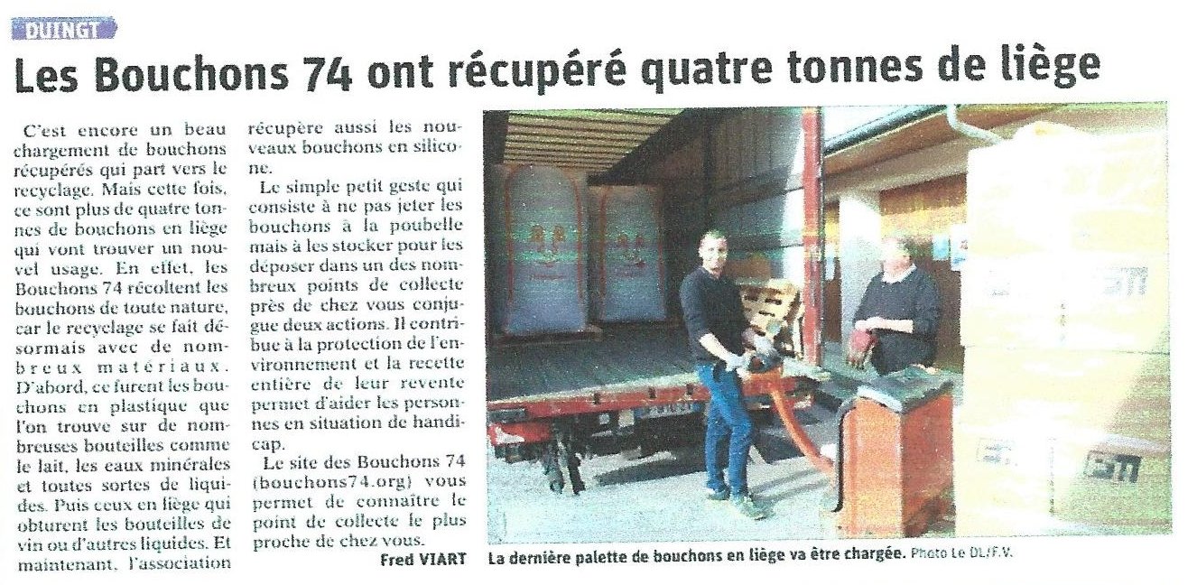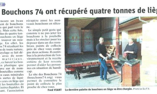 Article du Dauphiné Libéré en date du : 01/04/2022 ; DUINGT : Les Bouchons 74 ont récupéré quatre tonnes de liège