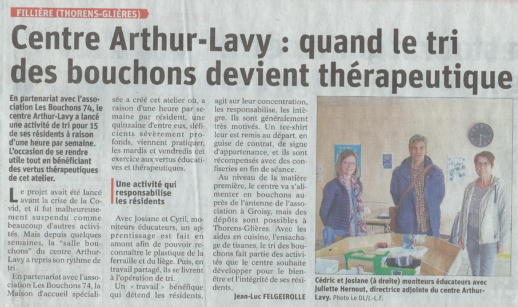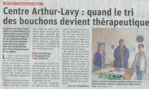 Article du Dauphiné Libéré en date du : 16/04/2022 ; FILLIÈRE (THORENS-GLIÈRES) : Centre Arthur-Lavy : quand le tri des bouchons devient thérapeutique