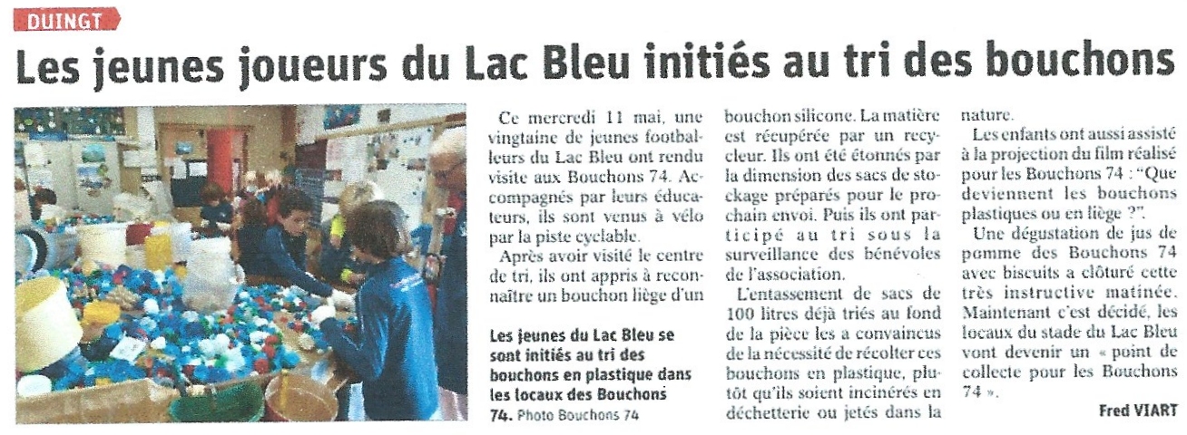 Article du Dauphiné Libéré en date du : 14/05/2022 ; DUINGT : Les jeunes joueurs du Lac Bleu initiés au tri des bouchons