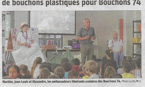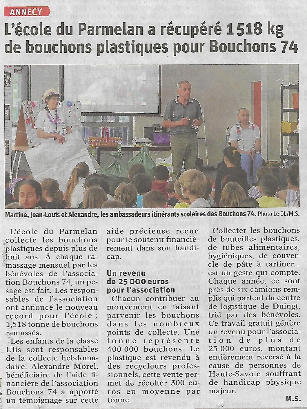 Article du Dauphiné Libéré en date du : 16/05/2022 ; ANNECY : L’école du Parmelan a récupéré 1 518 kg de bouchons plastiques pour Bouchons 74