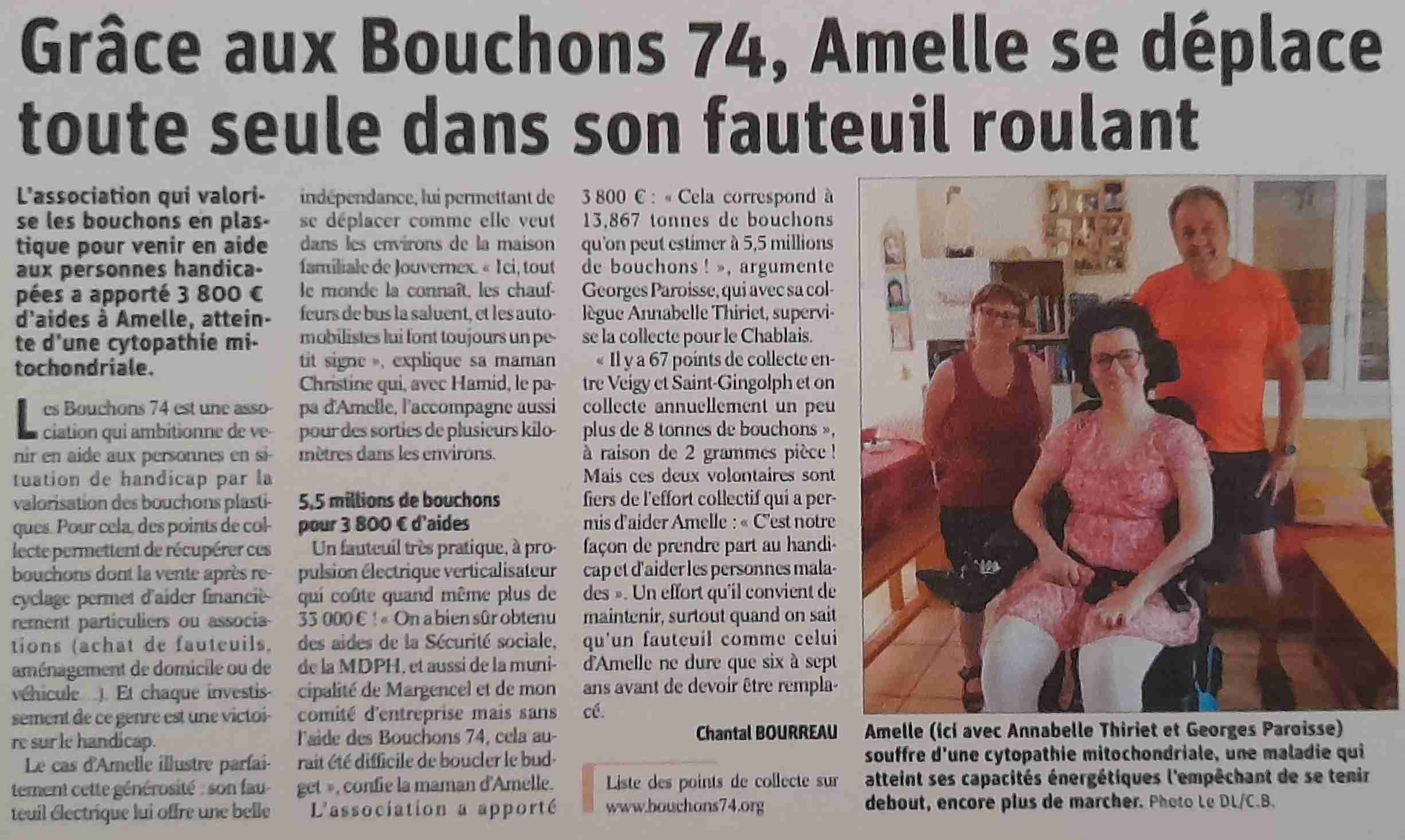 Article du Dauphiné Libéré en date du : 26/05/2022 ; MARGENCEL : Grâce aux Bouchons 74, Amelle se déplace toute seule dans son fauteuil roulant