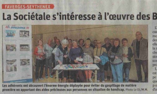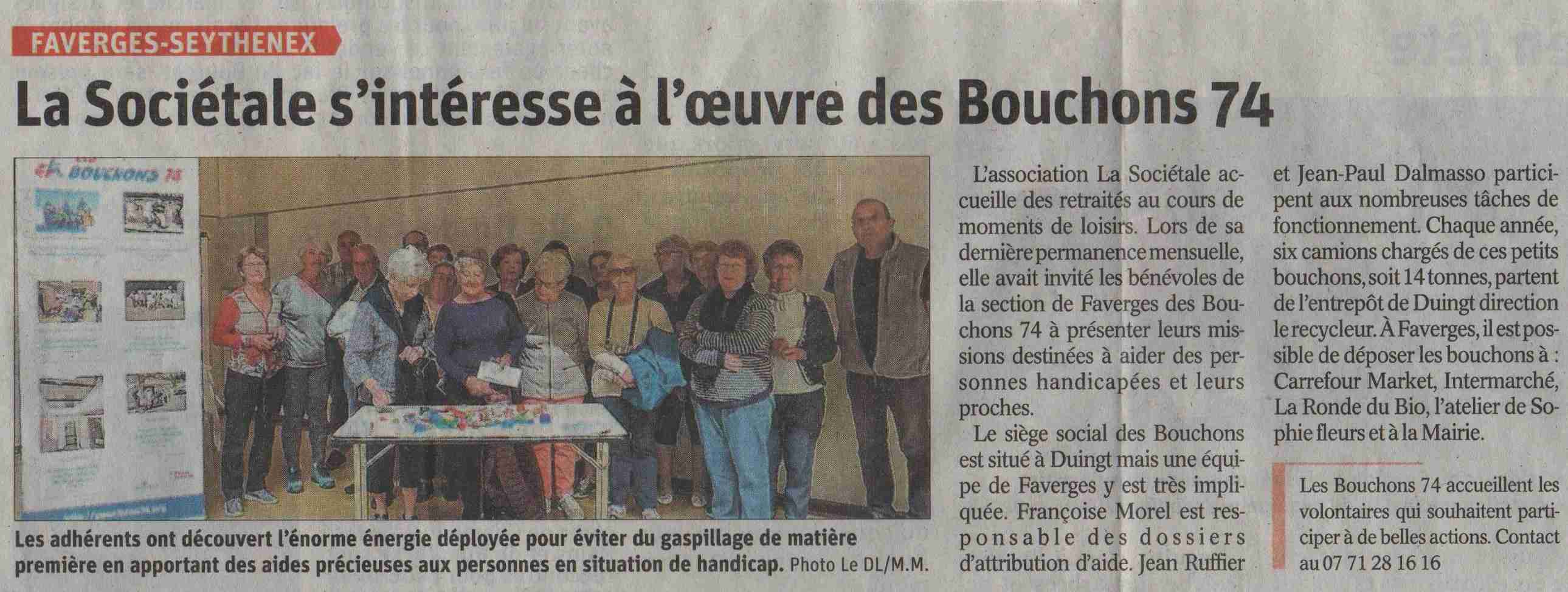Article du Dauphiné Libéré en date du : 15/06/2022 ; FAVERGES-SEYTHENEX : La Sociétale s’intéresse à l’oeuvre des Bouchons 74