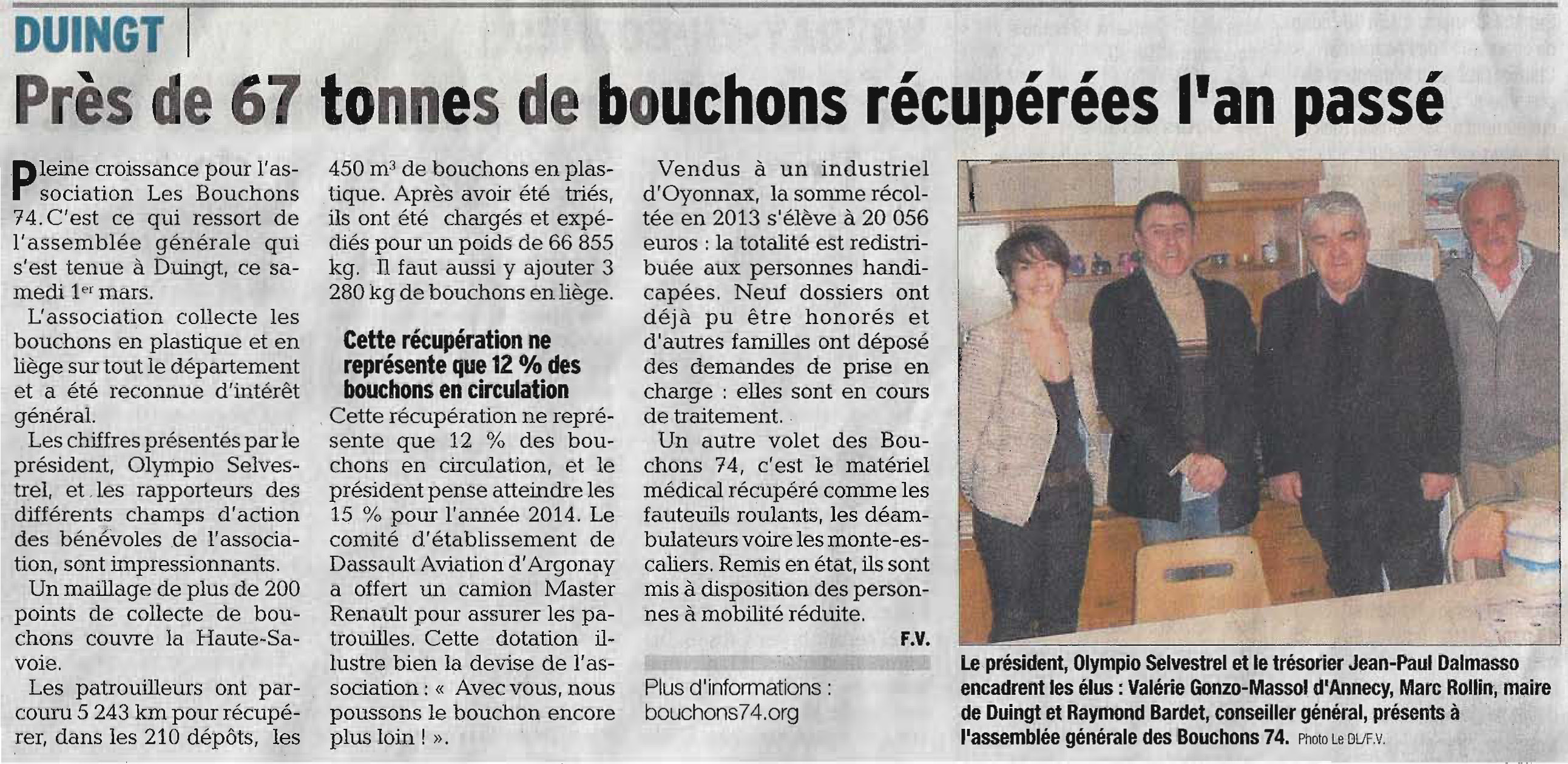 Article du Dauphiné Libéré en date du : 07/03/2014 ; DUINGT, près de 67 tonnes de bouchons récupérées l’an passé