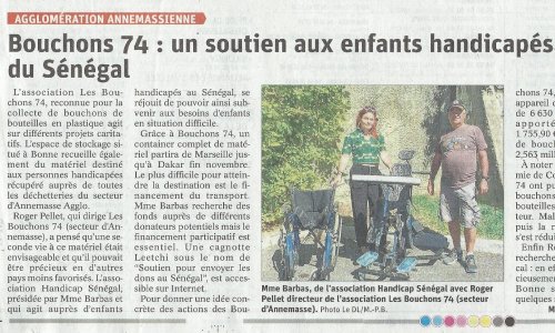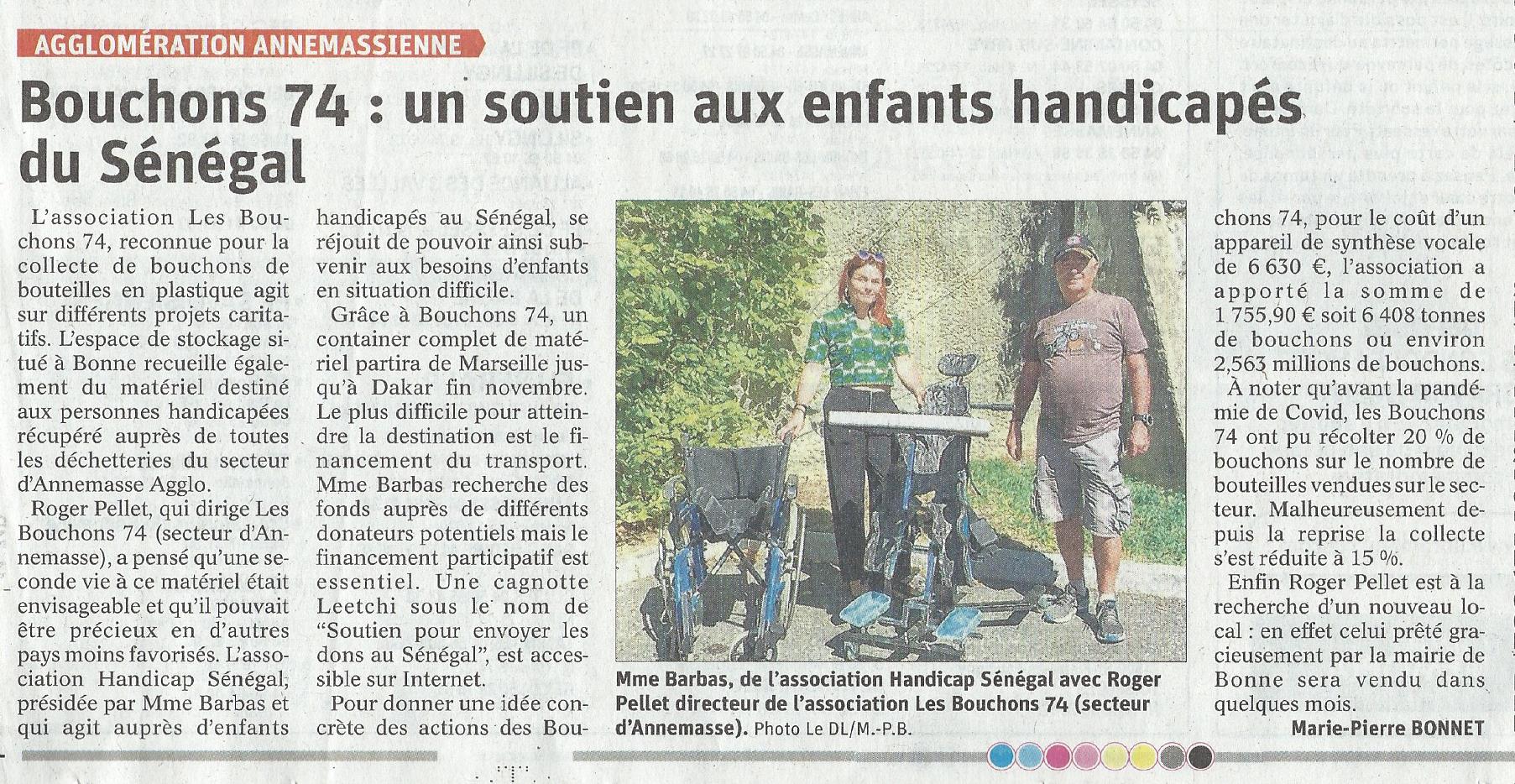 Article du Dauphiné Libéré en date du : 06/09/2022 ; Agglomération Annemassienne : Bouchons 74 : un soutien aux enfants handicapés du Sénégal
