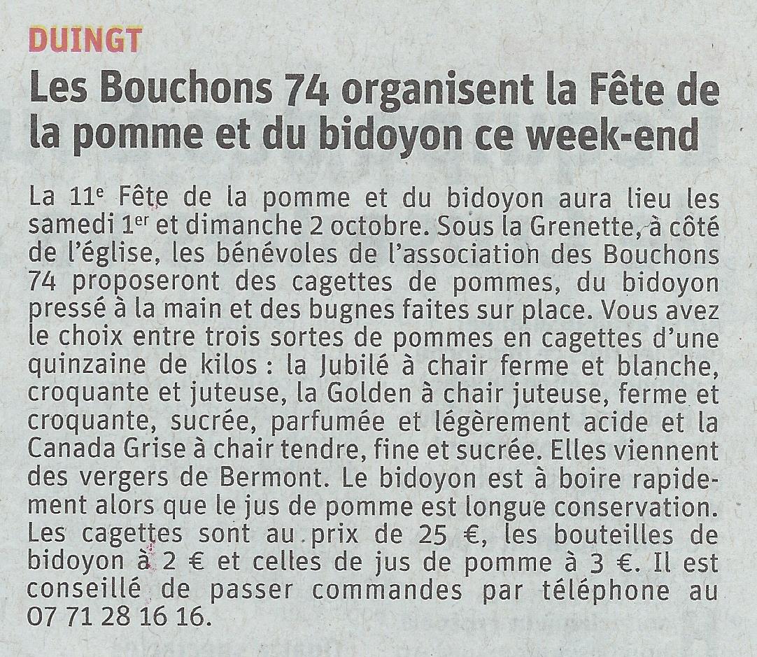 Article du Dauphiné Libéré en date du : 30/09/2022 ; DUINGT : Les Bouchons 74 organisent la Fête de la pomme et du bidoyon ce week-end