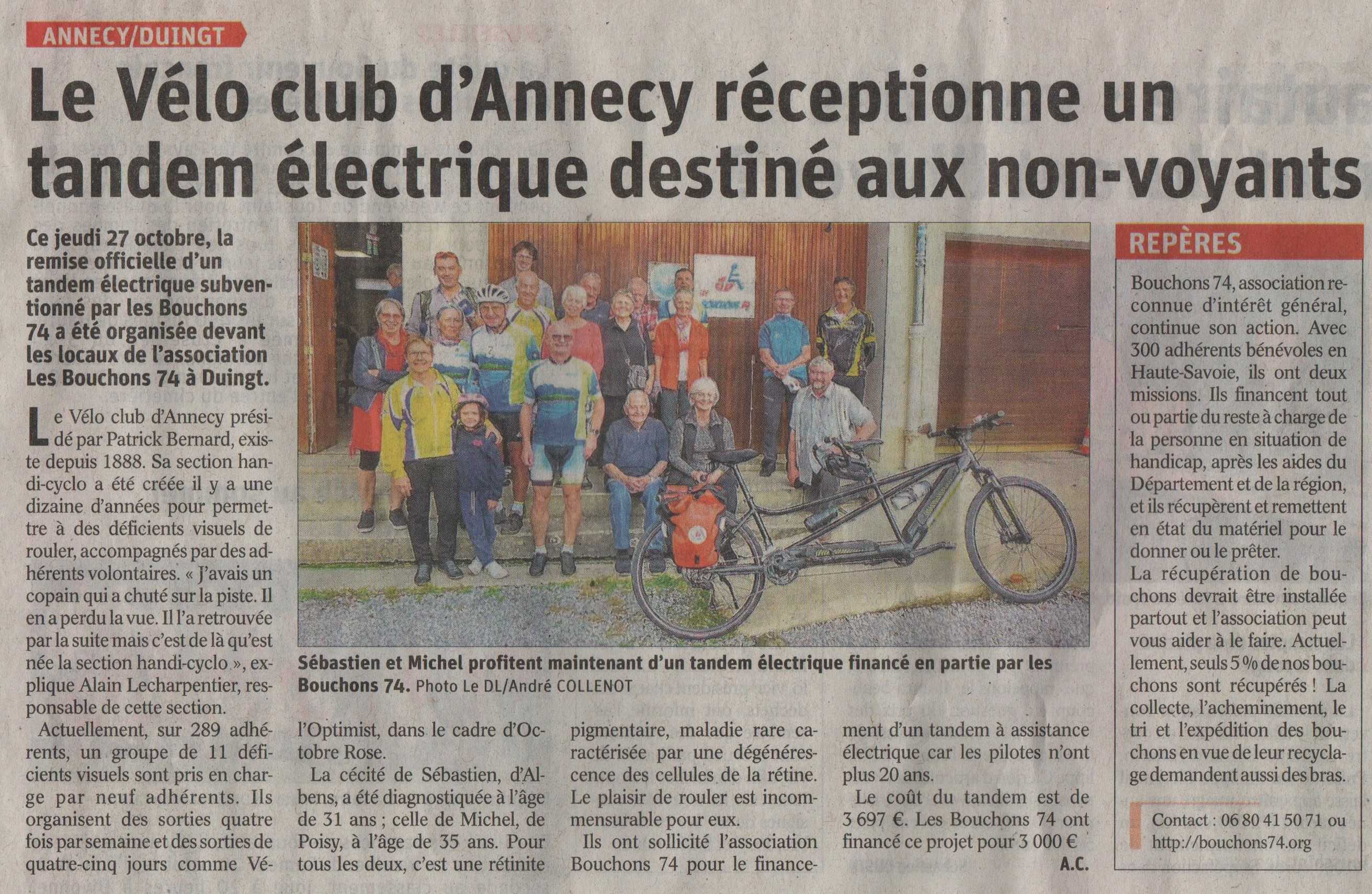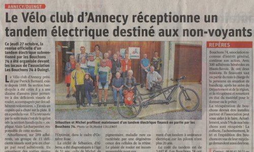 Article du Dauphiné Libéré en date du : 29/10/2022 ; ANNECY/DUINGT : Le Vélo Club d’Annecy réceptionne un tandem électrique destiné aux non-voyants