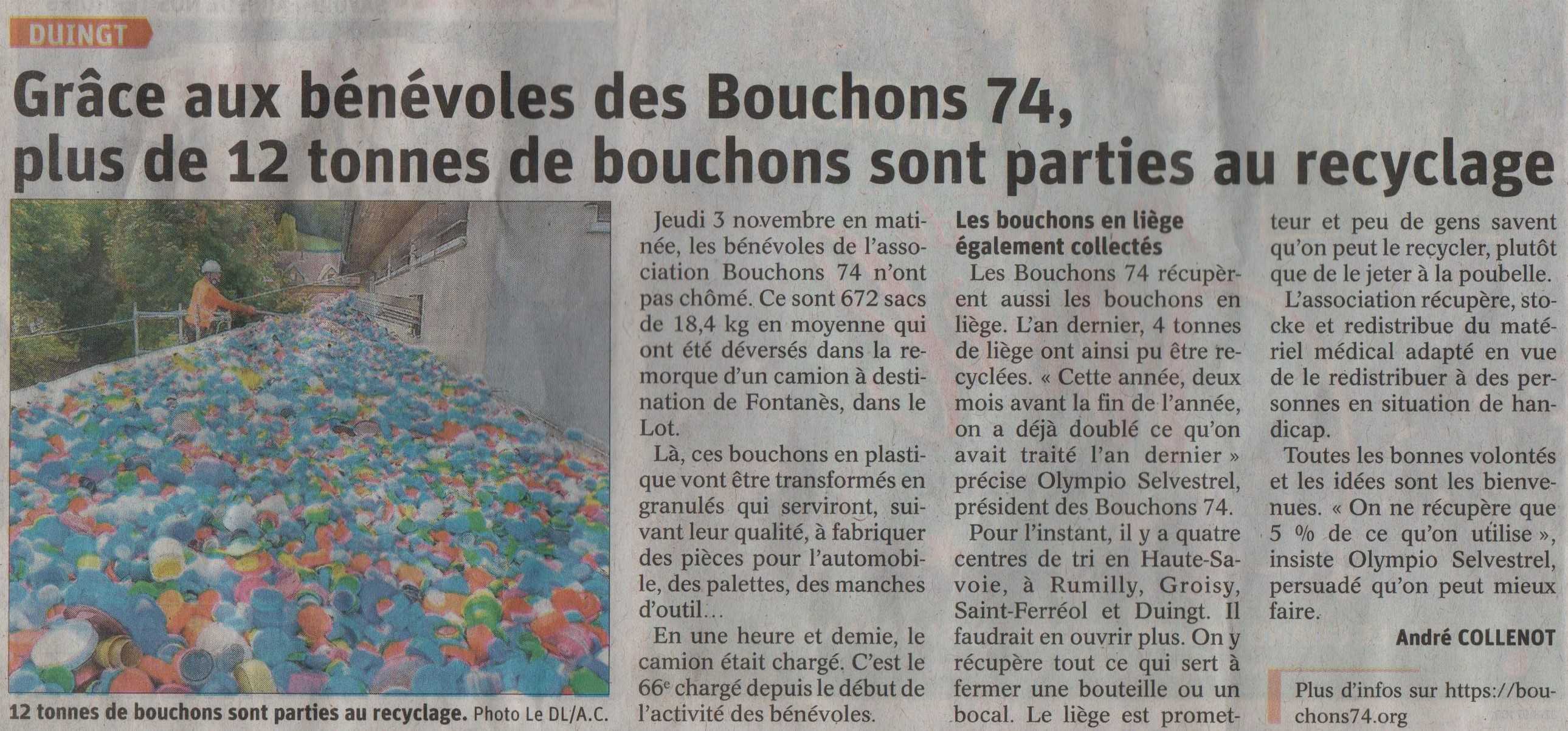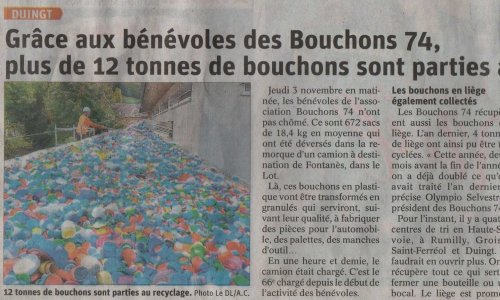 Article du Dauphiné Libéré en date du : 06/11/2022 ; DUINGT : Grâce aux bénévoles des Bouchons 74, plus de 12 tonnes de bouchons sont parties au recyclage