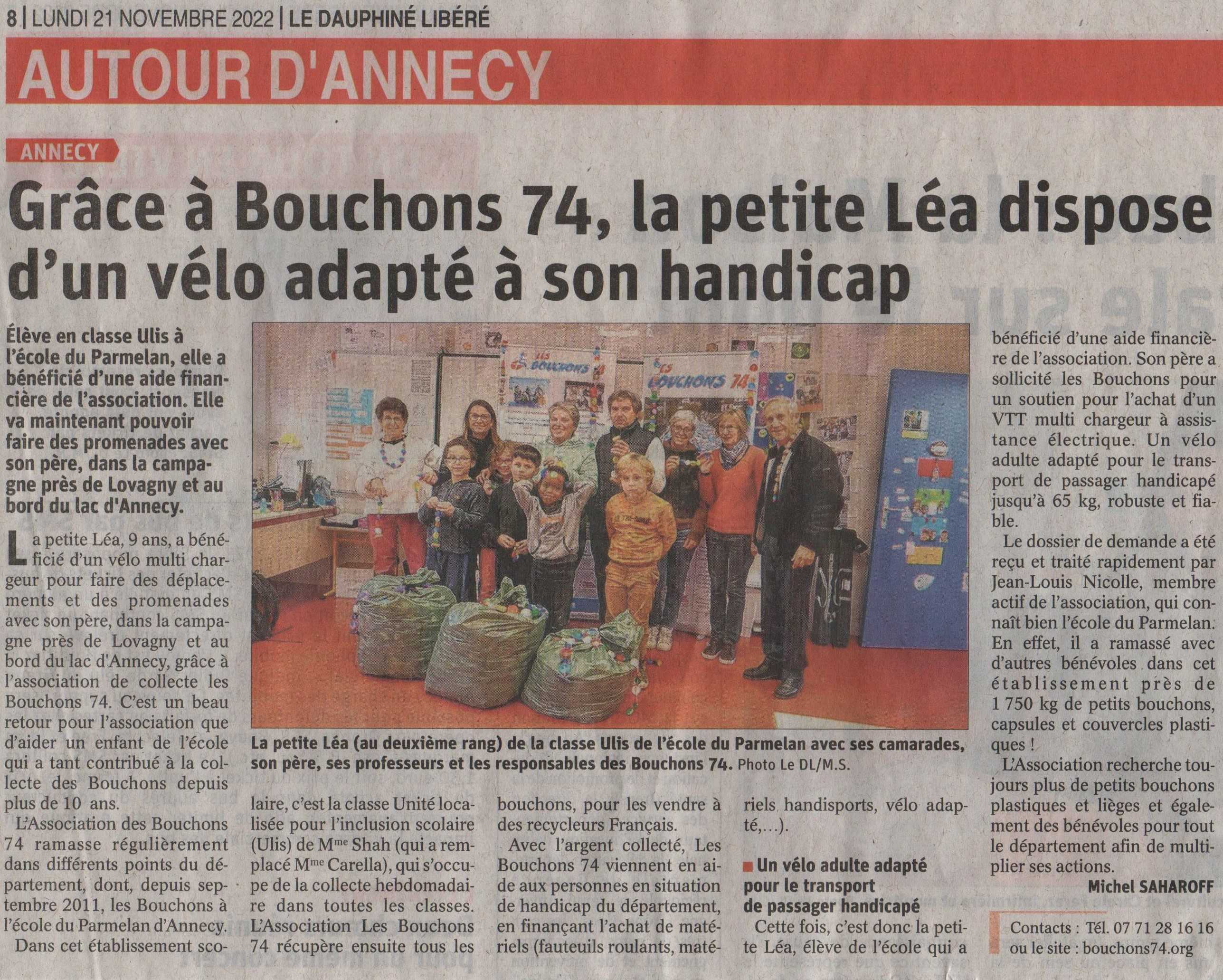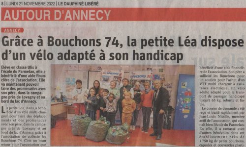 Article du Dauphiné Libéré en date du : 21/11/2022 ; ANNECY : Grâce à Bouchons 74, la petite Léa dispose d’un vélo adapté à son handicap