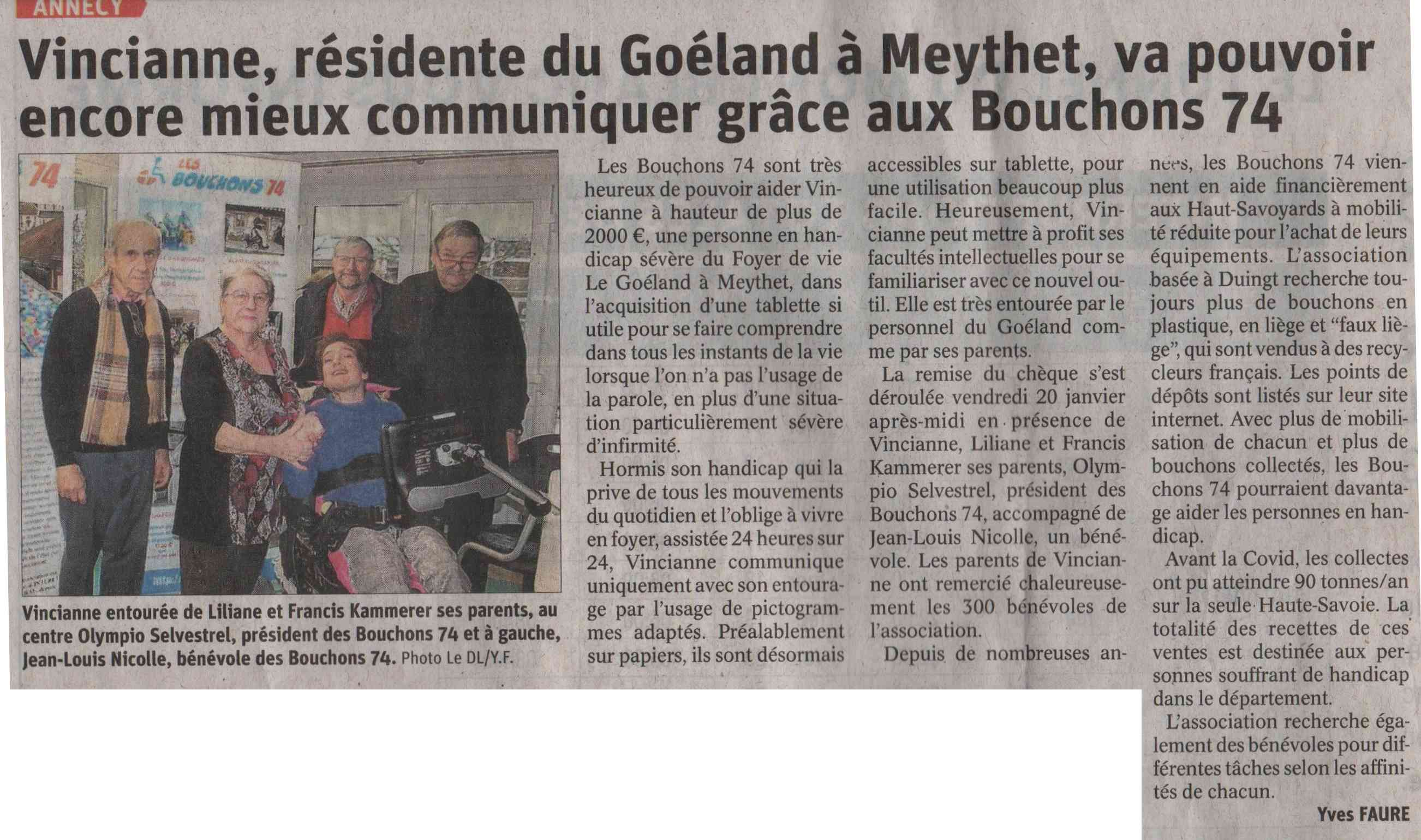 Article du Dauphiné Libéré en date du : 22/01/2023 ; ANNECY : Vincianne, résidente du Goéland à Meythet, va pouvoir encore mieux communiquer grâce aux Bouchons 74