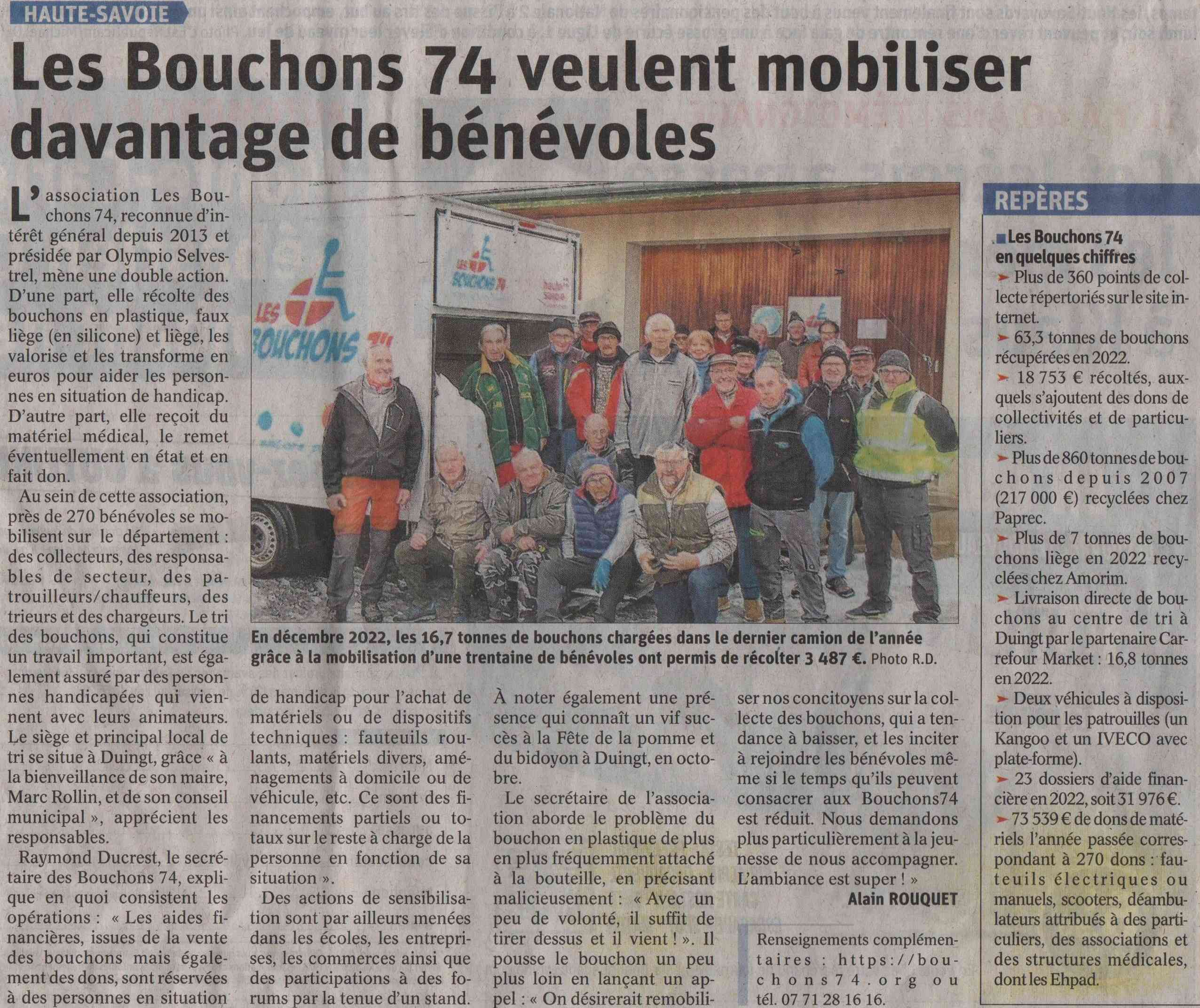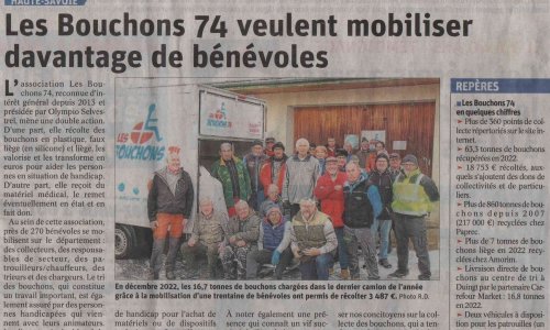 Article du Dauphiné Libéré en date du : 23/01/2023 ; HAUTE-SAVOIE : Les Bouchons 74 veulent mobiliser davantage de bénévoles