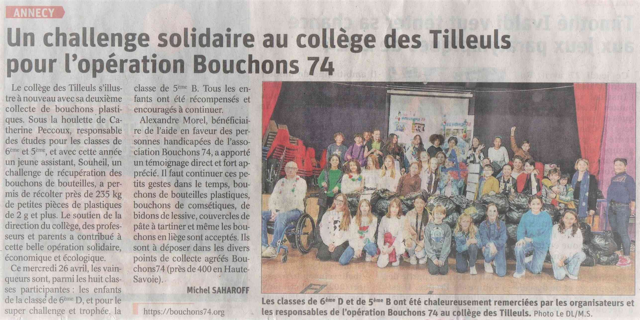 Article du Dauphiné Libéré en date du : 28/04/2023 ; ANNECY : Un challenge solidaire au collège des Tilleuls pour l’opération Bouchons 74