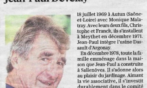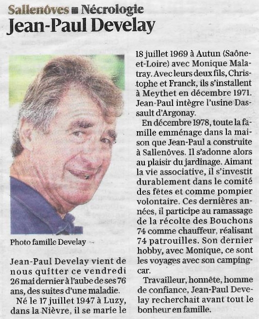Article du Dauphiné Libéré en date du : 02/06/2023 ; SALLENÔVES ; Nécrologie, Jean-Paul DEVELAY