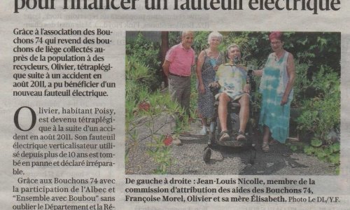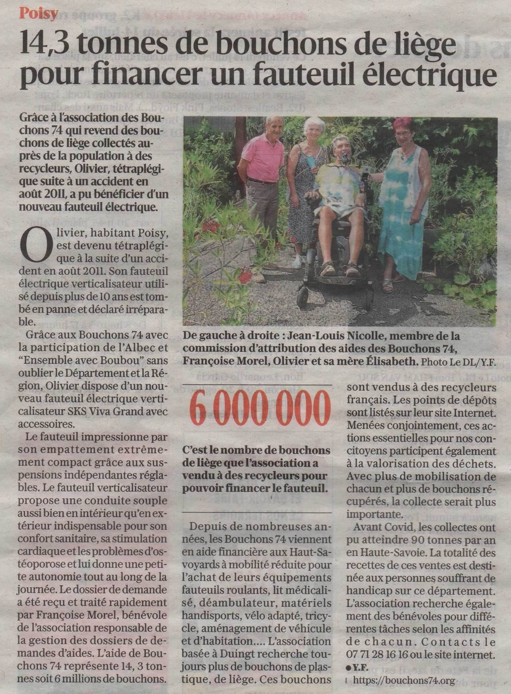 Article du Dauphiné Libéré en date du : 13/07/2023 ; Poisy ; 14,3 tonnes de bouchons de liège pour financer un fauteuil électrique