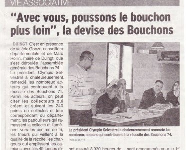 Article du Dauphiné Libéré en date du : 10/02/2016 ; Vie associative : Avec vous, poussons le bouchon un peu plus loin, devise des Bouchons 74