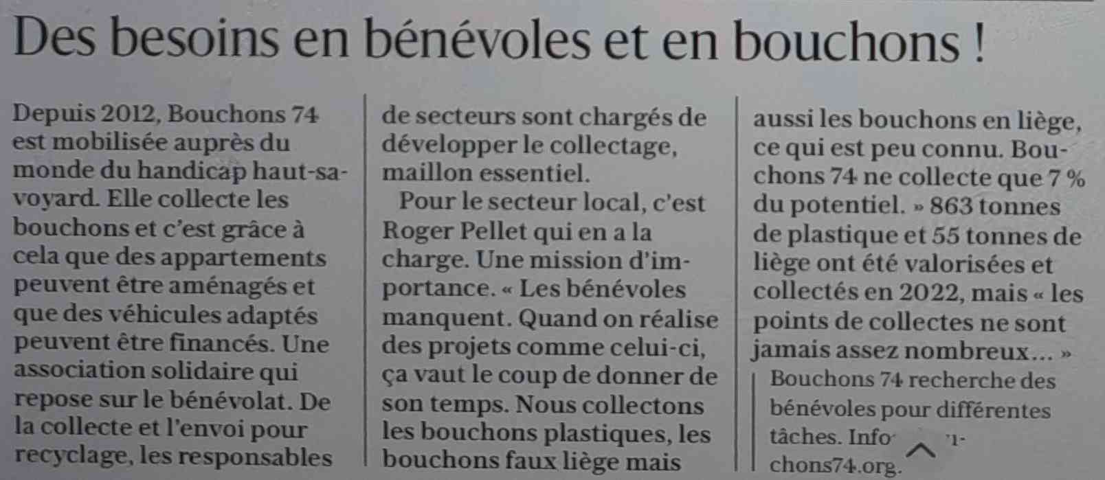 Article du Dauphiné Libéré en date du : 18/11/2023 ; La Roche sur Foron ; Des besoins en bénévoles et en bouchons !