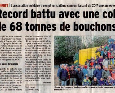Le mercredi 1er mars 2017, le centre de tri de DUINGT a reçu la livraison impressionnante de plus de 2 tonnes de bouchons de la collecte du « (…)