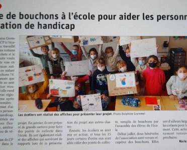 Article du Dauphiné Libéré en date du : 18/07/2022 ; PERS-JUSSY : Récolte de bouchons à l’école pour aider les personnes en situation de handicap