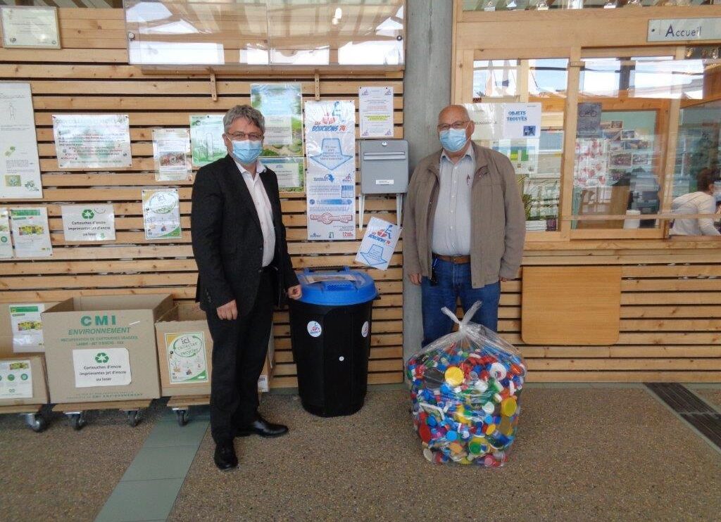 M. PERRADIN, proviseur, a remis ce jeudi 06 mai 2021 à M. Christian BUAT, collecteur responsable du secteur Rumilly et Albanais, pour l’association Bouchons 74 un sac d’une centaine de litres de bouchons.