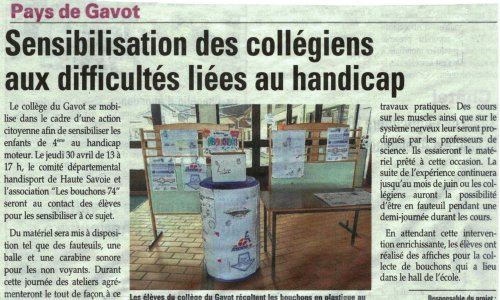 Article du Messager du 05-03-2015 ; Pays de Gavot : Sensibilisation des collégiens aux difficultés liées au handicap