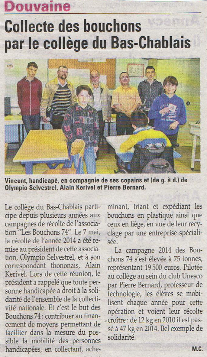 Article du Messager du : 13/05/2015 ; DOUVAINE : Collecte des bouchons par le collège du Bas-Chablais