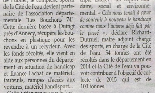 Article du Dauphiné Libéré en date du : 20/12/2023 ; La Balme de Sillingy ; Presque 400 kg récoltés pour Bouchons 74
