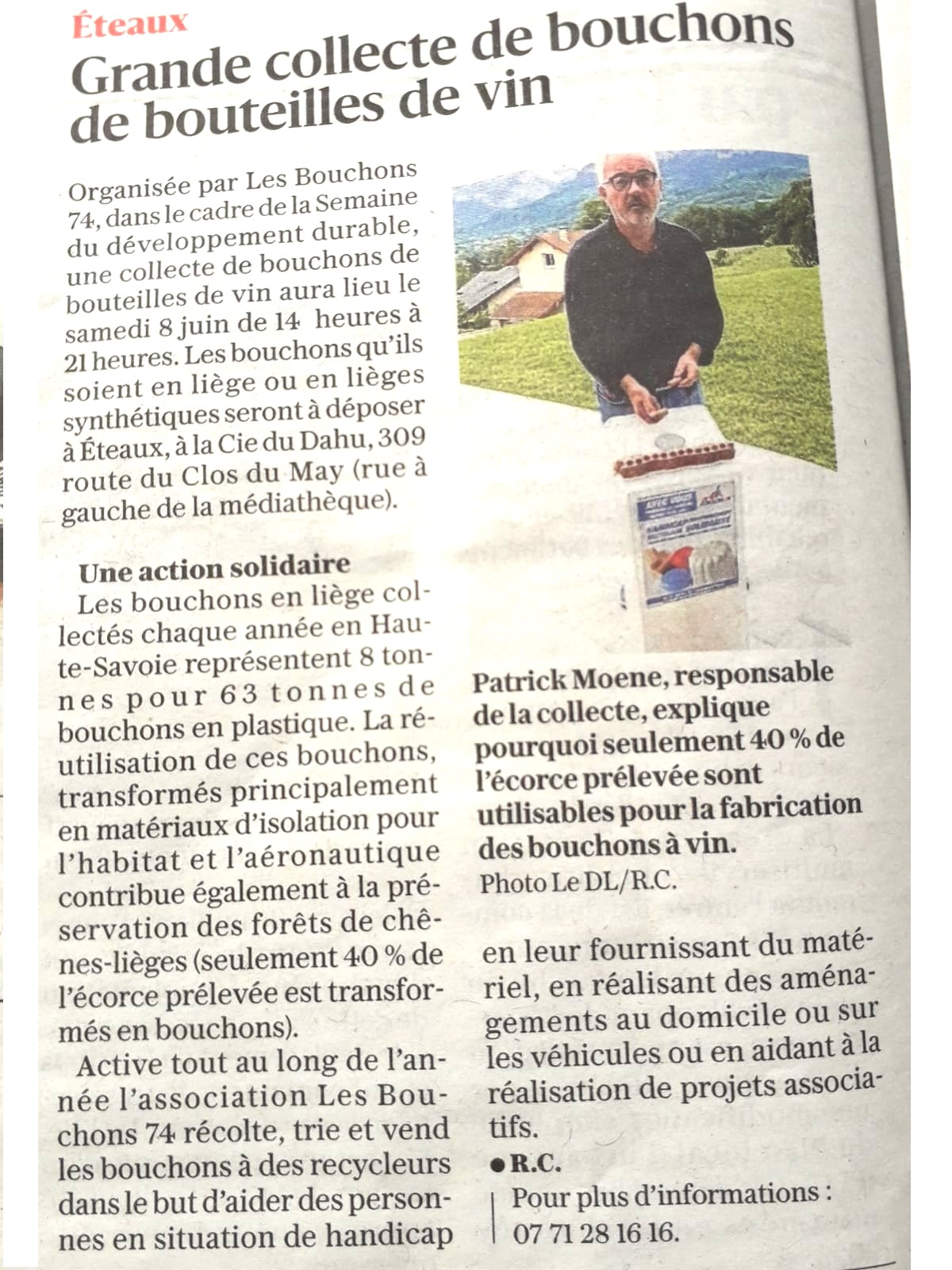 Article du Progrès en date du : 02/06/2024 ; Éteaux ; Grande collecte de bouchons de bouteuilles de vin