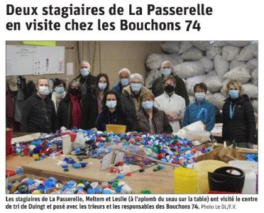 Article du Dauphiné Libéré en date du : 19/03/2021 ; DUINGT : Deux stagiaires de la Passerelle en visite chez les Bouchons 74
